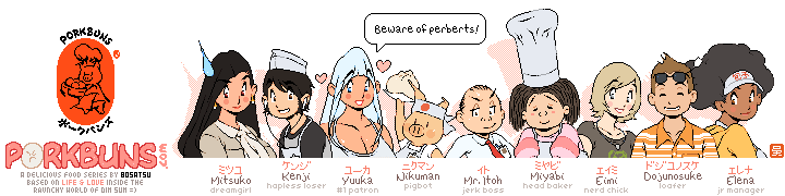 PORKBUNS© is a racy slice of life, food & art series that follows the lives of mismatched couple: love starved loser Kenji and snack hungry, voluptuous beauty Yuuka. Kenji works as a clerk at a small oriental bakeshop aptly named ‘PORKBUNS’, who’s business (and love life) has been flailing until the day a mysterious girl with an uncontrollable appetite visits the shop.